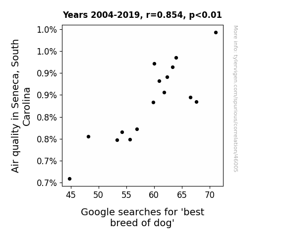 This means 72.9% of the change in the one variable (i.e., Google searches for 'best breed of dog') is predictable based on the change in the other (i.e., Air quality in Seneca, South Carolina) over the 16 years from 2004 through 2019.