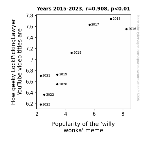 This means 82.5% of the change in the one variable (i.e., Popularity of the 'willy wonka' meme) is predictable based on the change in the other (i.e., How geeky LockPickingLawyer YouTube video titles are) over the 9 years from 2015 through 2023.