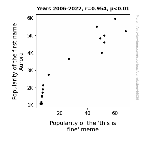 This means 91% of the change in the one variable (i.e., Popularity of the 'this is fine' meme) is predictable based on the change in the other (i.e., Popularity of the first name Aurora) over the 17 years from 2006 through 2022.