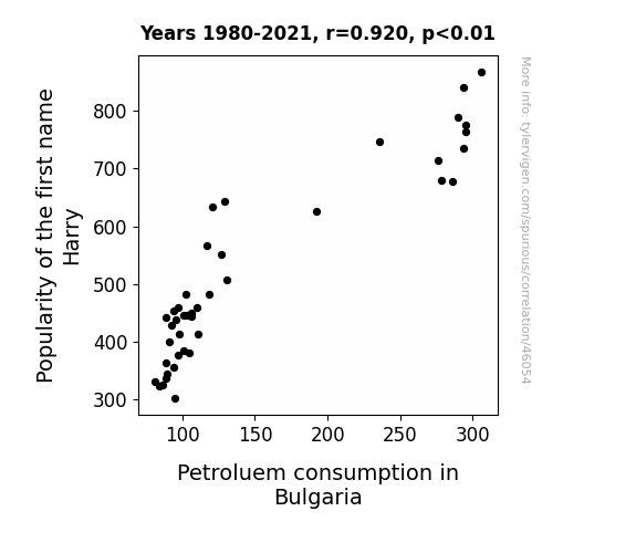 This means 84.7% of the change in the one variable (i.e., Petroluem consumption in Bulgaria) is predictable based on the change in the other (i.e., Popularity of the first name Harry) over the 42 years from 1980 through 2021.