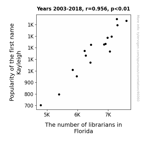 This means 91.4% of the change in the one variable (i.e., The number of librarians in Florida) is predictable based on the change in the other (i.e., Popularity of the first name Kayleigh) over the 16 years from 2003 through 2018.
