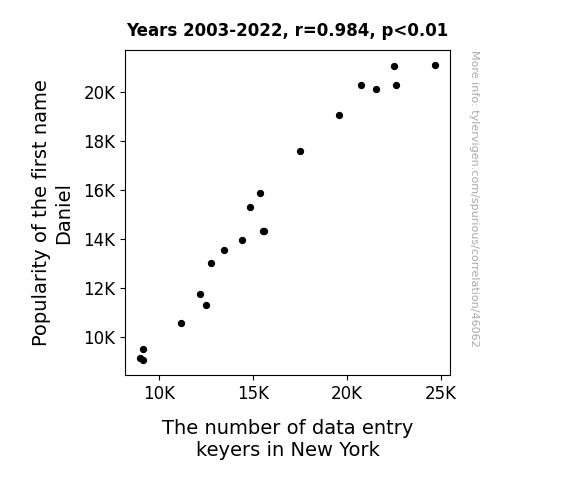 This means 96.8% of the change in the one variable (i.e., The number of data entry keyers in New York) is predictable based on the change in the other (i.e., Popularity of the first name Daniel) over the 20 years from 2003 through 2022.