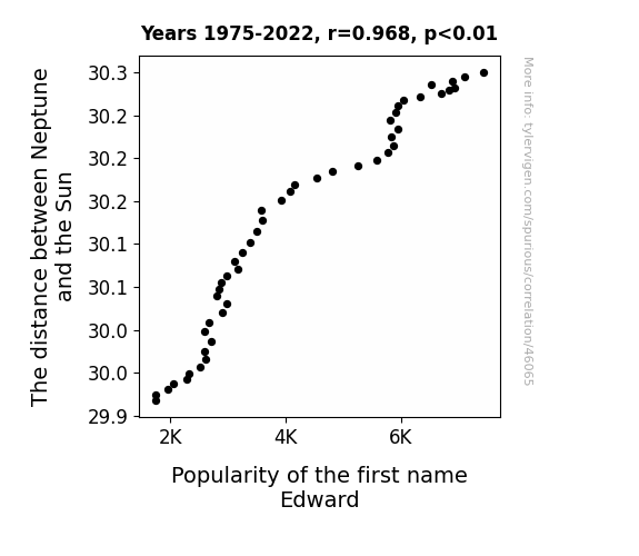This means 93.7% of the change in the one variable (i.e., Popularity of the first name Edward) is predictable based on the change in the other (i.e., The distance between Neptune and the Sun) over the 48 years from 1975 through 2022.