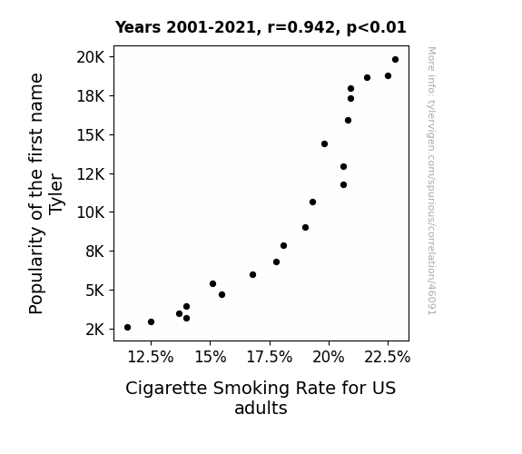 This means 88.7% of the change in the one variable (i.e., Cigarette Smoking Rate for US adults) is predictable based on the change in the other (i.e., Popularity of the first name Tyler) over the 21 years from 2001 through 2021.