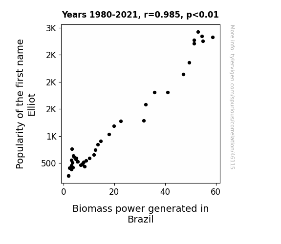 This means 97% of the change in the one variable (i.e., Biomass power generated in Brazil) is predictable based on the change in the other (i.e., Popularity of the first name Elliot) over the 42 years from 1980 through 2021.