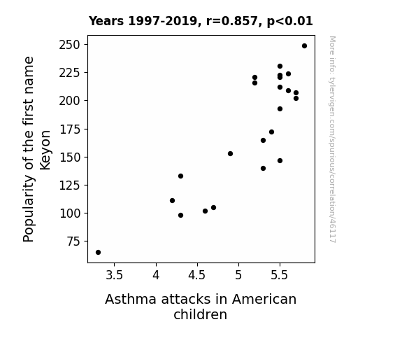 This means 73.5% of the change in the one variable (i.e., Asthma attacks in American children) is predictable based on the change in the other (i.e., Popularity of the first name Keyon) over the 23 years from 1997 through 2019.