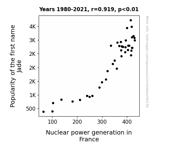 This means 84.4% of the change in the one variable (i.e., Nuclear power generation in France) is predictable based on the change in the other (i.e., Popularity of the first name Jade) over the 42 years from 1980 through 2021.