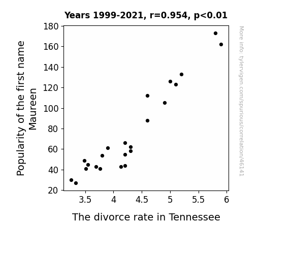 This means 91.1% of the change in the one variable (i.e., The divorce rate in Tennessee) is predictable based on the change in the other (i.e., Popularity of the first name Maureen) over the 23 years from 1999 through 2021.