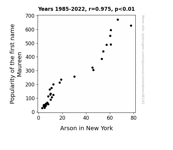 This means 95.1% of the change in the one variable (i.e., Arson in New York) is predictable based on the change in the other (i.e., Popularity of the first name Maureen) over the 38 years from 1985 through 2022.