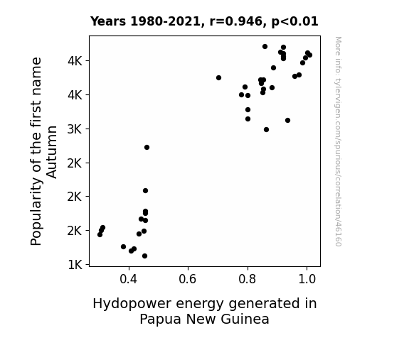This means 89.4% of the change in the one variable (i.e., Hydopower energy generated in Papua New Guinea) is predictable based on the change in the other (i.e., Popularity of the first name Autumn) over the 42 years from 1980 through 2021.