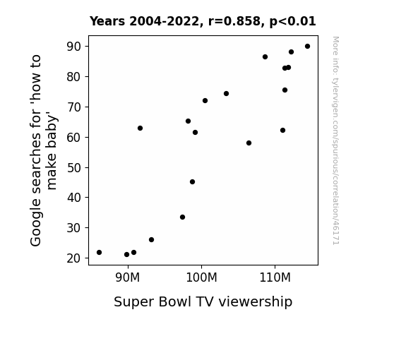 This means 73.7% of the change in the one variable (i.e., Super Bowl TV viewership) is predictable based on the change in the other (i.e., Google searches for 'how to make baby') over the 19 years from 2004 through 2022.