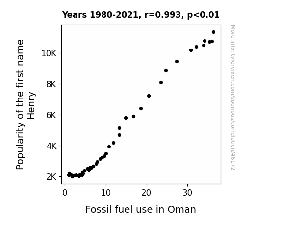 This means 98.6% of the change in the one variable (i.e., Fossil fuel use in Oman) is predictable based on the change in the other (i.e., Popularity of the first name Henry) over the 42 years from 1980 through 2021.