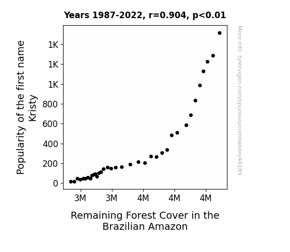 This means 81.8% of the change in the one variable (i.e., Remaining Forest Cover in the Brazilian Amazon) is predictable based on the change in the other (i.e., Popularity of the first name Kristy) over the 36 years from 1987 through 2022.