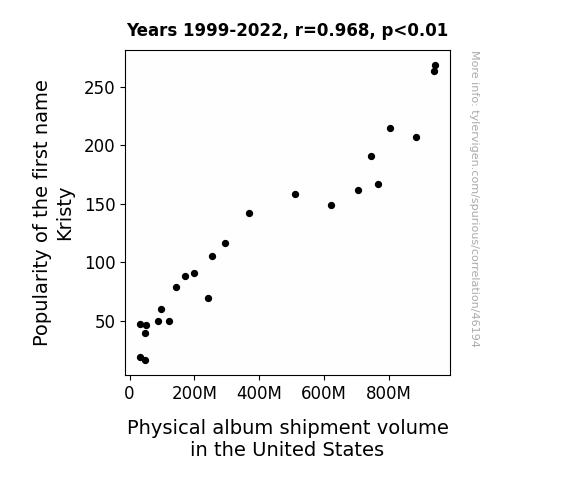 This means 93.7% of the change in the one variable (i.e., Physical album shipment volume in the United States) is predictable based on the change in the other (i.e., Popularity of the first name Kristy) over the 24 years from 1999 through 2022.