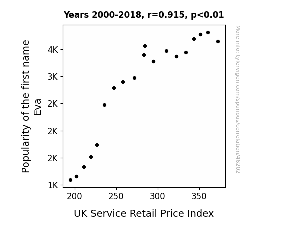 This means 83.8% of the change in the one variable (i.e., UK Service Retail Price Index) is predictable based on the change in the other (i.e., Popularity of the first name Eva) over the 19 years from 2000 through 2018.