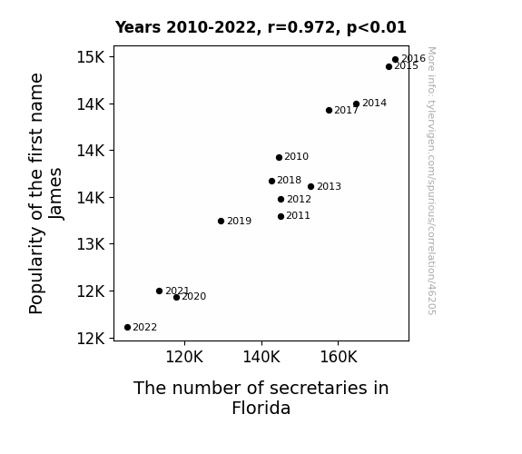 This means 94.5% of the change in the one variable (i.e., The number of secretaries in Florida) is predictable based on the change in the other (i.e., Popularity of the first name James) over the 13 years from 2010 through 2022.