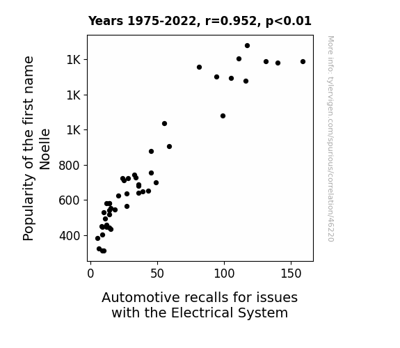 This means 90.6% of the change in the one variable (i.e., Automotive recalls for issues with the Electrical System) is predictable based on the change in the other (i.e., Popularity of the first name Noelle) over the 48 years from 1975 through 2022.