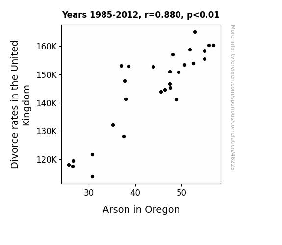 This means 77.4% of the change in the one variable (i.e., Arson in Oregon) is predictable based on the change in the other (i.e., Divorce rates in the United Kingdom) over the 28 years from 1985 through 2012.