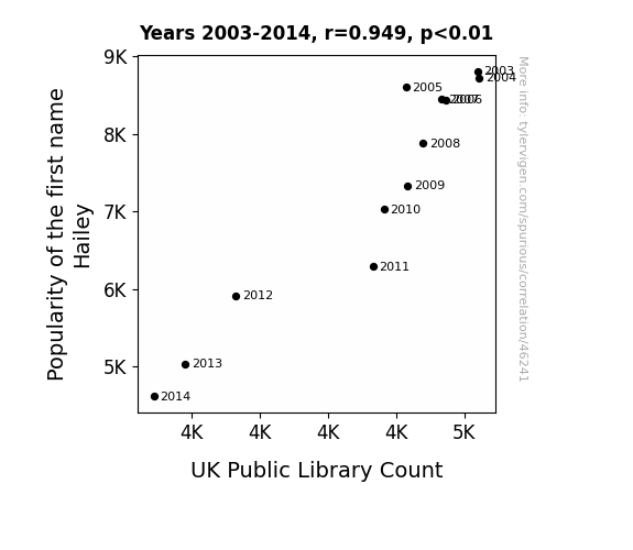 This means 90% of the change in the one variable (i.e., UK Public Library Count) is predictable based on the change in the other (i.e., Popularity of the first name Hailey) over the 12 years from 2003 through 2014.