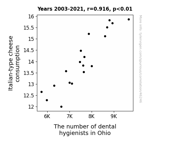 This means 83.9% of the change in the one variable (i.e., The number of dental hygienists in Ohio) is predictable based on the change in the other (i.e., Italian-type cheese consumption) over the 19 years from 2003 through 2021.