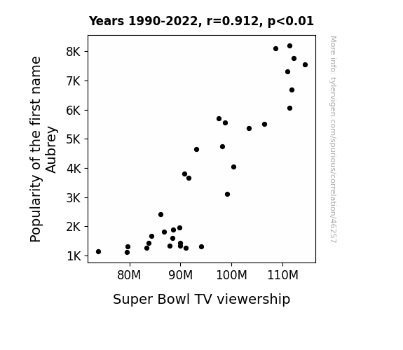 This means 83.1% of the change in the one variable (i.e., Super Bowl TV viewership) is predictable based on the change in the other (i.e., Popularity of the first name Aubrey) over the 33 years from 1990 through 2022.