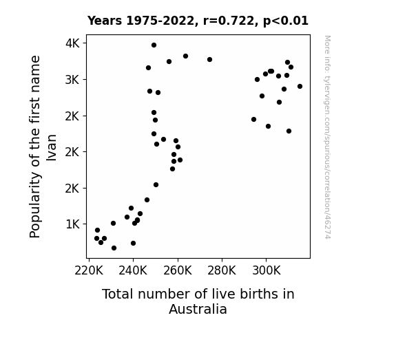 This means 52.1% of the change in the one variable (i.e., Total number of live births in Australia) is predictable based on the change in the other (i.e., Popularity of the first name Ivan) over the 48 years from 1975 through 2022.