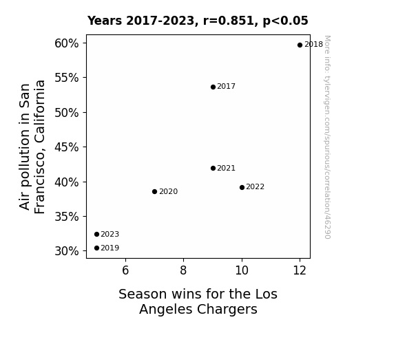 This means 72.5% of the change in the one variable (i.e., Season wins for the Los Angeles Chargers) is predictable based on the change in the other (i.e., Air pollution in San Francisco, California) over the 7 years from 2017 through 2023.