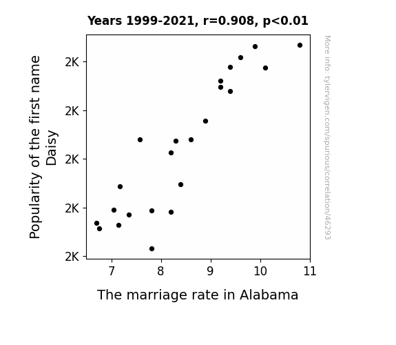 This means 82.5% of the change in the one variable (i.e., The marriage rate in Alabama) is predictable based on the change in the other (i.e., Popularity of the first name Daisy) over the 23 years from 1999 through 2021.
