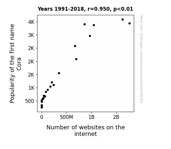 This means 90.2% of the change in the one variable (i.e., Number of websites on the internet) is predictable based on the change in the other (i.e., Popularity of the first name Cora) over the 28 years from 1991 through 2018.