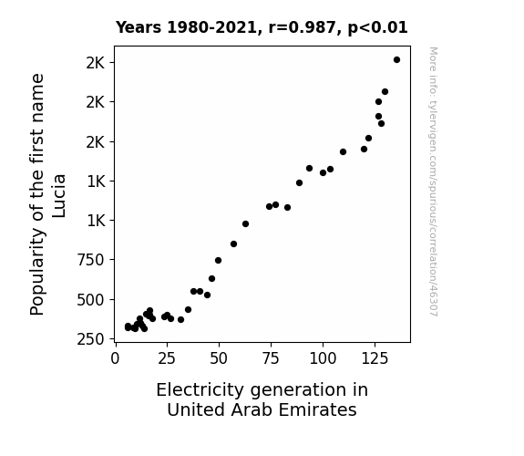 This means 97.4% of the change in the one variable (i.e., Electricity generation in United Arab Emirates) is predictable based on the change in the other (i.e., Popularity of the first name Lucia) over the 42 years from 1980 through 2021.