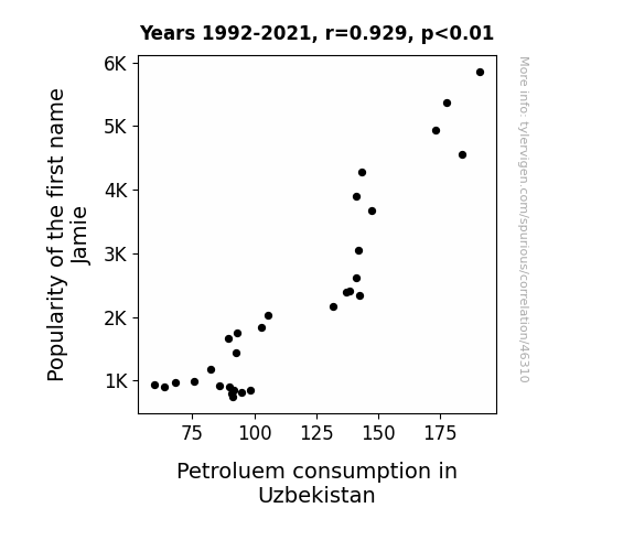 This means 86.3% of the change in the one variable (i.e., Petroluem consumption in Uzbekistan) is predictable based on the change in the other (i.e., Popularity of the first name Jamie) over the 30 years from 1992 through 2021.