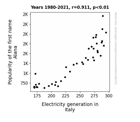 This means 83% of the change in the one variable (i.e., Electricity generation in Italy) is predictable based on the change in the other (i.e., Popularity of the first name Alana) over the 42 years from 1980 through 2021.