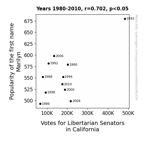 This means 49.3% of the change in the one variable (i.e., Votes for Libertarian Senators in California) is predictable based on the change in the other (i.e., Popularity of the first name Marilyn) over the 11 years from 1980 through 2010.
