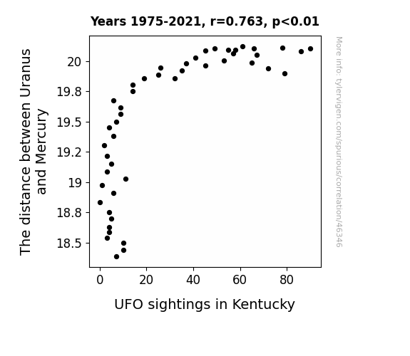 This means 58.2% of the change in the one variable (i.e., UFO sightings in Kentucky) is predictable based on the change in the other (i.e., The distance between Uranus and Mercury) over the 47 years from 1975 through 2021.