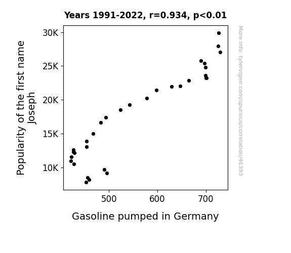 This means 87.2% of the change in the one variable (i.e., Gasoline pumped in Germany) is predictable based on the change in the other (i.e., Popularity of the first name Joseph) over the 32 years from 1991 through 2022.