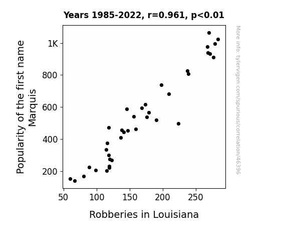 This means 92.3% of the change in the one variable (i.e., Robberies in Louisiana) is predictable based on the change in the other (i.e., Popularity of the first name Marquis) over the 38 years from 1985 through 2022.