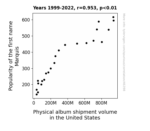 This means 90.9% of the change in the one variable (i.e., Physical album shipment volume in the United States) is predictable based on the change in the other (i.e., Popularity of the first name Marquis) over the 24 years from 1999 through 2022.