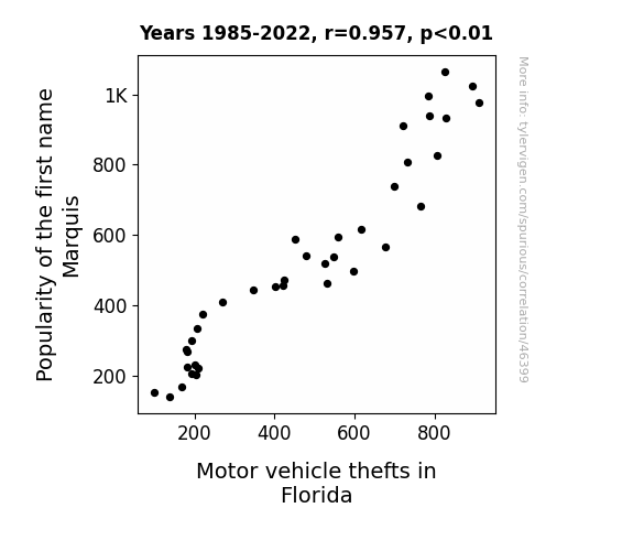 This means 91.6% of the change in the one variable (i.e., Motor vehicle thefts in Florida) is predictable based on the change in the other (i.e., Popularity of the first name Marquis) over the 38 years from 1985 through 2022.