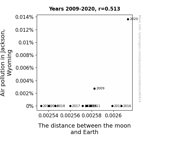 This means 26.4% of the change in the one variable (i.e., The distance between the moon and Earth) is predictable based on the change in the other (i.e., Air pollution in Jackson, Wyoming) over the 12 years from 2009 through 2020.