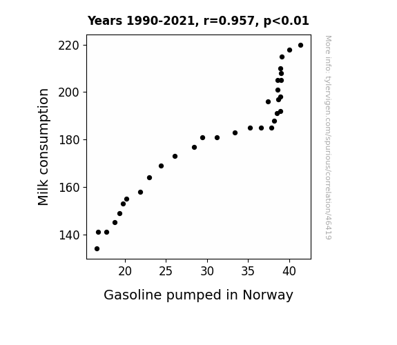 This means 91.5% of the change in the one variable (i.e., Gasoline pumped in Norway) is predictable based on the change in the other (i.e., Milk consumption) over the 32 years from 1990 through 2021.