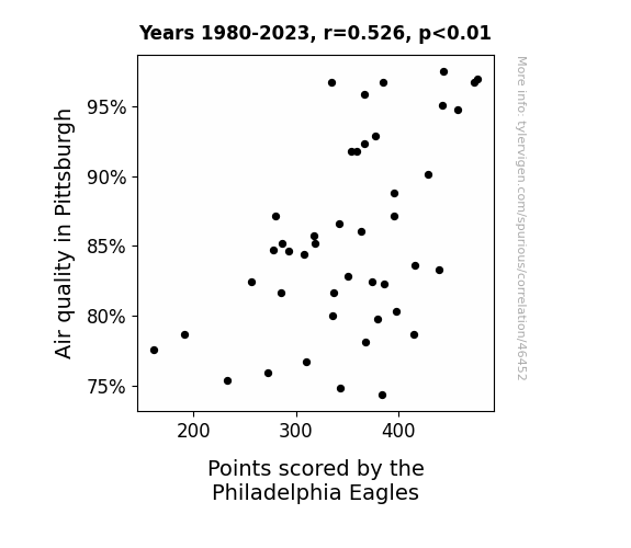 This means 27.7% of the change in the one variable (i.e., Points scored by the Philadelphia Eagles) is predictable based on the change in the other (i.e., Air quality in Pittsburgh) over the 44 years from 1980 through 2023.