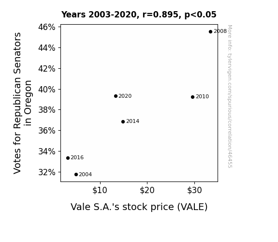 This means 80.1% of the change in the one variable (i.e., Vale S.A.'s stock price (VALE)) is predictable based on the change in the other (i.e., Votes for Republican Senators in Oregon) over the 6 years from 2003 through 2020.