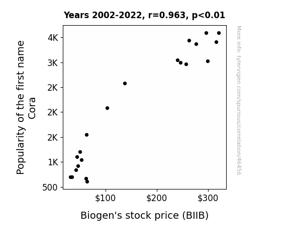 This means 92.7% of the change in the one variable (i.e., Biogen's stock price (BIIB)) is predictable based on the change in the other (i.e., Popularity of the first name Cora) over the 21 years from 2002 through 2022.