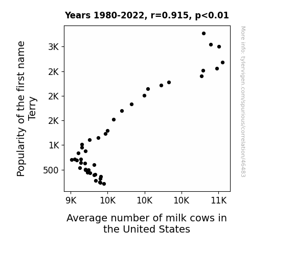 This means 83.7% of the change in the one variable (i.e., Average number of milk cows in the United States) is predictable based on the change in the other (i.e., Popularity of the first name Terry) over the 43 years from 1980 through 2022.