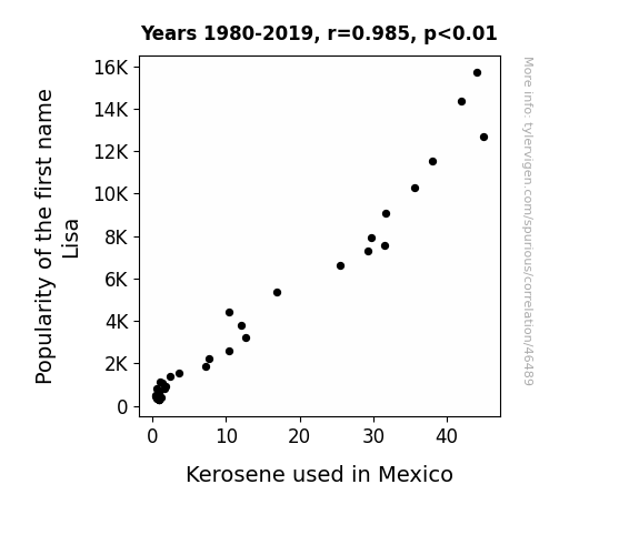This means 97% of the change in the one variable (i.e., Kerosene used in Mexico) is predictable based on the change in the other (i.e., Popularity of the first name Lisa) over the 40 years from 1980 through 2019.