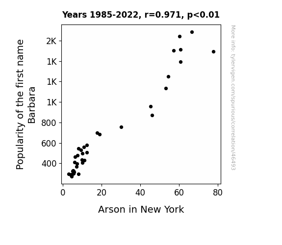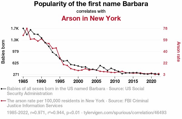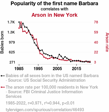 A linear line chart with years as the X-axis and two variables on the Y-axis. The first variable is Popularity of the first name Barbara and the second variable is Arson in New York.  The chart goes from 1985 to 2022, and the two variables track closely in value over that time. Small Image
