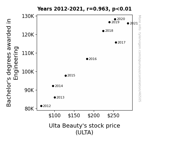 This means 92.8% of the change in the one variable (i.e., Ulta Beauty's stock price (ULTA)) is predictable based on the change in the other (i.e., Bachelor's degrees awarded in Engineering) over the 10 years from 2012 through 2021.