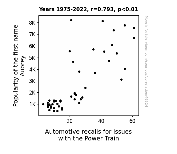 This means 62.9% of the change in the one variable (i.e., Automotive recalls for issues with the Power Train) is predictable based on the change in the other (i.e., Popularity of the first name Aubrey) over the 48 years from 1975 through 2022.