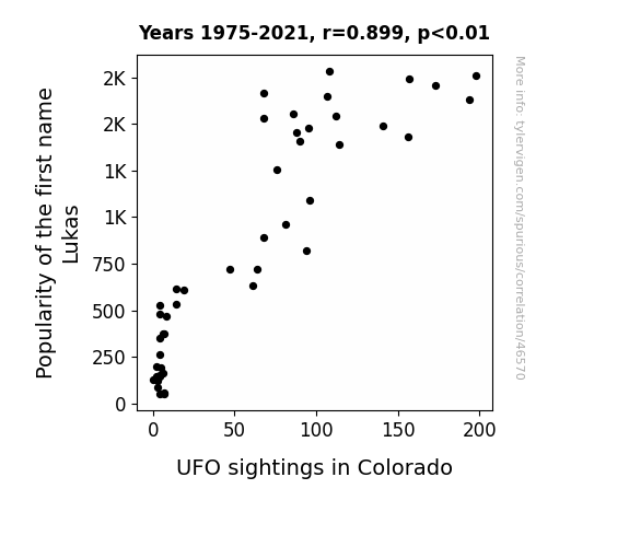 This means 80.9% of the change in the one variable (i.e., UFO sightings in Colorado) is predictable based on the change in the other (i.e., Popularity of the first name Lukas) over the 47 years from 1975 through 2021.