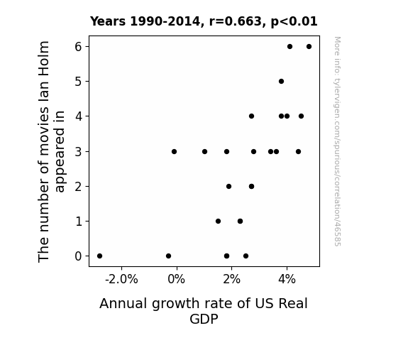 This means 44% of the change in the one variable (i.e., Annual growth rate of US Real GDP) is predictable based on the change in the other (i.e., The number of movies Ian Holm appeared in) over the 25 years from 1990 through 2014.